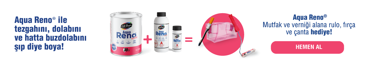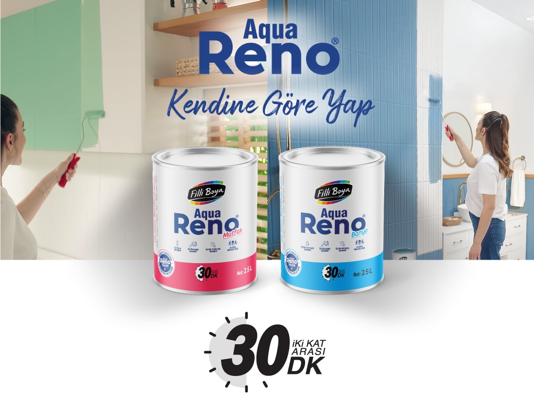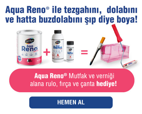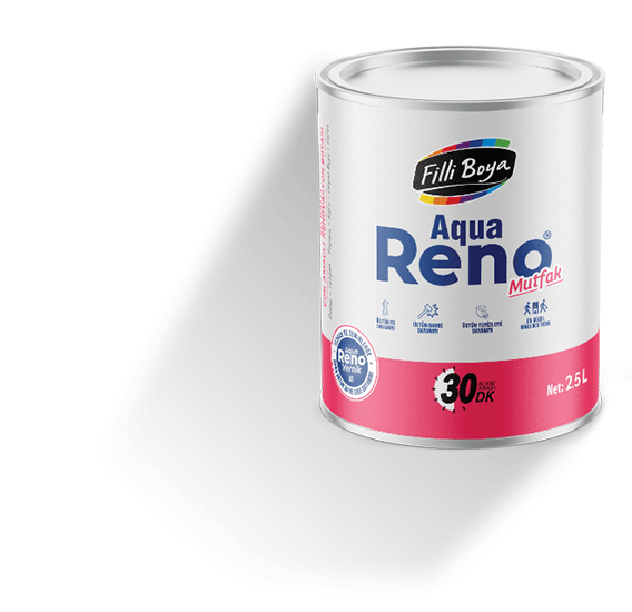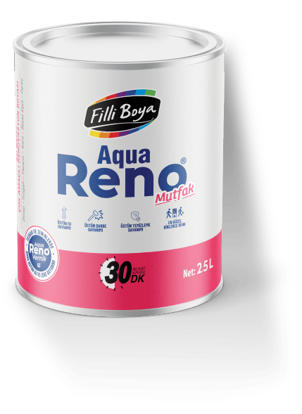Aqua Reno® Mutfak, ev güzelleştirme fikirleri için geliştirilen, ipeksi mat dokuda, tam silinebilen ve yıkanabilen, kendinden katalizörlü polimer (Self Catalyzed Polymer) teknolojisine sahip, su bazlı, çok amaçlı renovasyon boyasıdır.