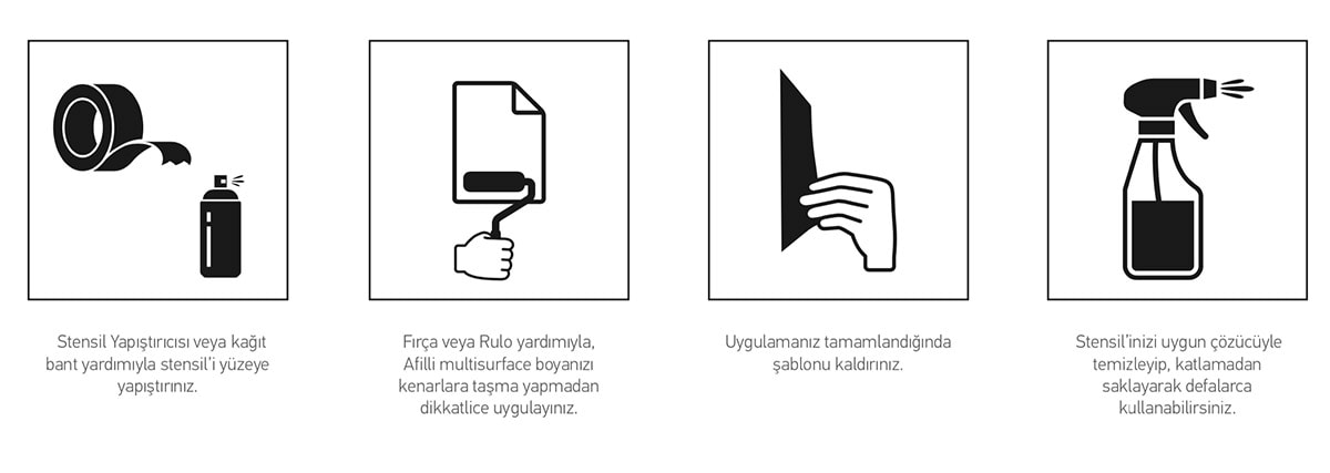 Yaşam alanlarını, duvarlarını kişiselleştirmek isteyen herkes için şimdi Afilli Stensil Koleksiyonu ile tanışma zamanı. İster küçük alanlara ister tüm duvarlara uygulayabileceğin özel tasarımlı desenler, evinde istediğin havayı yakalamana yardımcı olacak. Arzu ettiğin deseni seçip Afilli Multisurface Acrylic Boyalar ile uyguladığında en mükemmel sonuçları alacak ve tam aklındaki görünümü kolayca yakalayacaksın. İlhamını evine bir dokunuşunla yansıt diye özel desenleriyle yepyeni stensil koleksiyonu Afilli de!